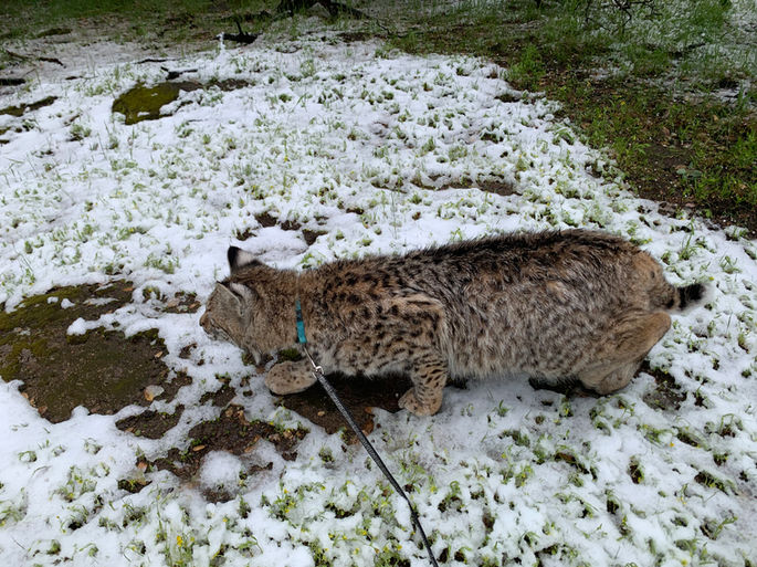 Captain (for El Capitan) was an 8-week old bobcat that came to us from Arkansas where it is legal to have bobcats as pets in 2023. He will now have the important job of being an educational ambassador for his species and showing why it is actually not good to have bobcats as pets. Many times our animals come to us as confiscated pets or animals that were being illegally sold as pets and come from very bad situations. We are excited to have the opportunity to raise a healthy and happy baby bobcat. He has adjusted to life at Wildworks very well and is growing by the day. He's already made fast friends with all of the dogs and house cats.